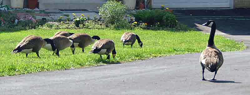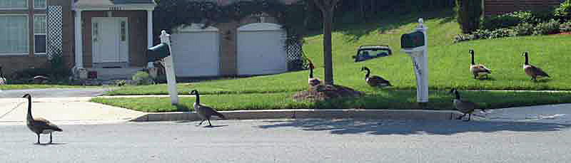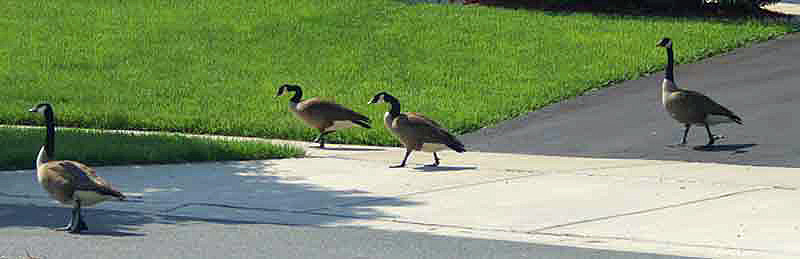 Hi, my name is Primo. Let me tell you a story about Mr. And Mrs. Goose who live nearby. We have a lot of Canada Geese that live on a golf course behind our forest. They like to swim on the water hazards on the golf course. They raise their families there. They live there all year long. I can hear the geese all day. Thank goodness they go to sleep at night and don’t make a lot of noise then. My humans wouldn’t like that. The geese know that they are in an area where they are protected. No hunters are allowed on the golf course or in the neighborhood where my house is. The geese like to live here because they know they are safe. Mr. and Mrs. Goose and their family like to visit the houses in our neighborhood. They act like they own them! Every morning at sunrise, Mr. and Mrs. Goose fly from their nesting area on the golf course to the roof tops of the houses in our neighborhood. They sit together on top of the roof and honk and honk and honk! They are loud! My humans say that the geese are like roosters. They honk everyone awake in the morning! The Goose family like to walk around to inspect the neighborhood. Some pictures of them are here. I do not know what they are looking for. Maybe they just like to get some exercise besides flying. My human read me the story about Onk-Or and his mate, who were geese that lived in Maryland and became famous in the book titled Chesapeake, written by James Michener. That story helped me to learn that geese mate for life. They take care of each other and their children. They protect their eggs and young hatchlings very strongly. They are very dedicated parents to their children, and to each other. Our geese do not migrate. They live on the golf course behind my house all year long. They like it here. They add enjoyment to my forest. I see them fly over our house. Sometimes there are a lot of geese flying in the air. When there are a lot of them, they form a "V". I guess that because they are geese, they know how to fly in a "V", even if they are not migrating north or south. They are fun to watch.